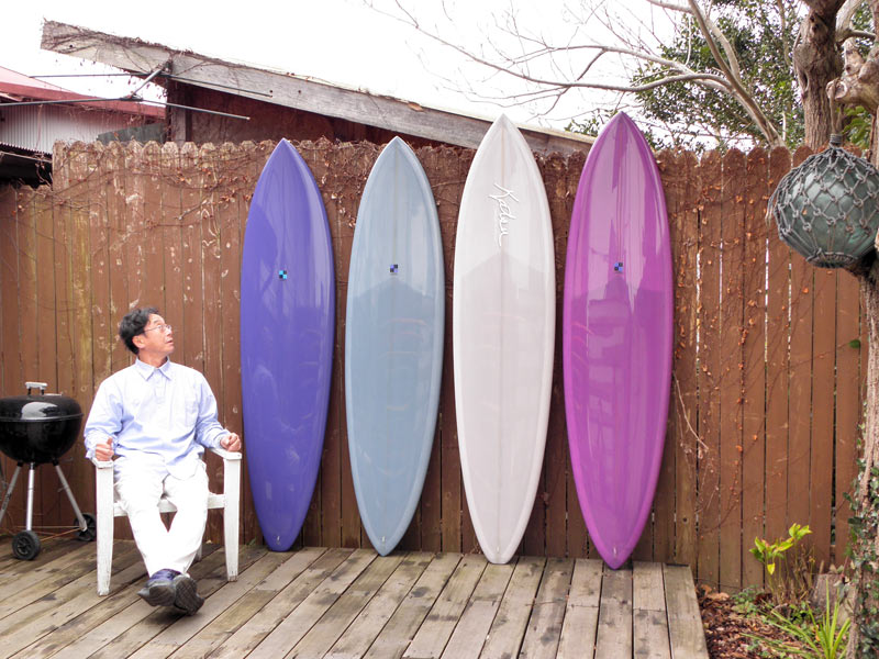 活さんも同じコンセプトで「TOTO」というロングボードモデルを盛んに作っています。現在テスト中で、シェイプや使用するブランクスなど、だいぶ煮詰まってきているようです。私も一本お願いしています。