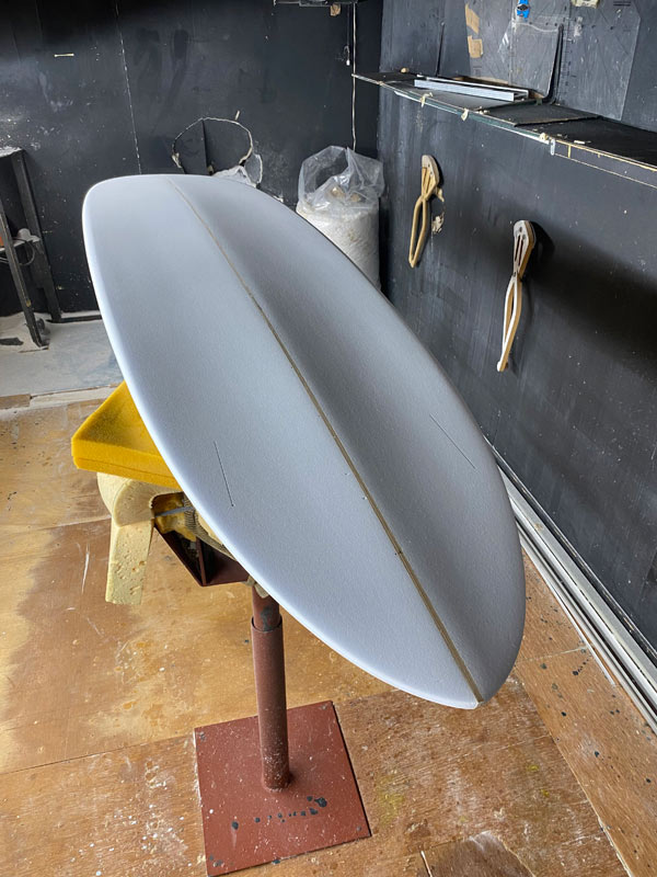 亜麻色のピグメントカラーで、ボトムをクリアにしました。バスウッドのストリンガーとの柔らかい調和を狙いました。フィンBOXもフワッと白です 笑。
