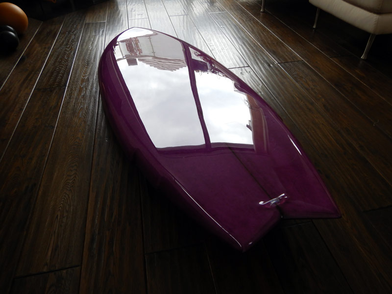 デッキだけベイビーピンクのピグメントダイがおしゃれです。そういうところもショートボードとはひと味違うところです。4オンスクロスのサンディングフィッシュで軽く仕上げています。