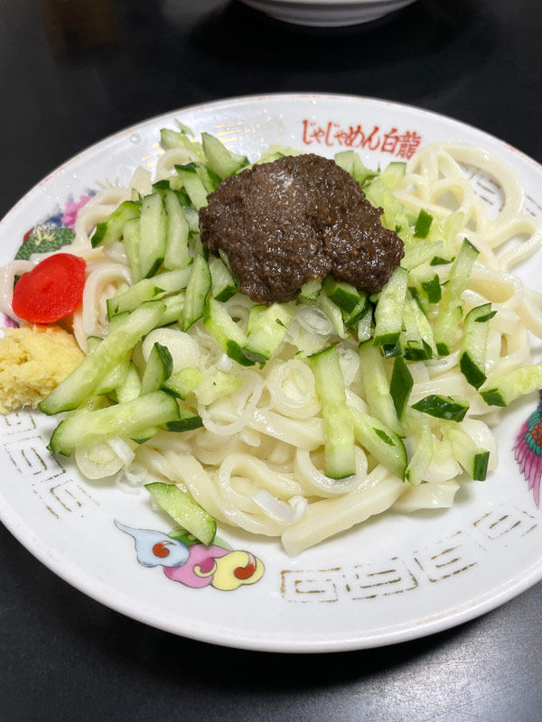 時間が経てば腹は減ります。盛岡冷麺と並んで有名な「じゃじゃ麺」はこんな感じです。中華料理のジャージャー麺は食べたことありますがそれとは別物らしい。もちろん初めてです。