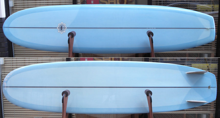 最初のボードがホビーのフィルエドワーズモデルだった私は、こういうロングボード大好きです。ノーズコンケーブが入らないボトムはとてもきれいなロールボトムです。それにスリーストリンガーのポイントノーズ。グライダーのようにスピードとトリミングを楽しむクラシックなスピードボードです。