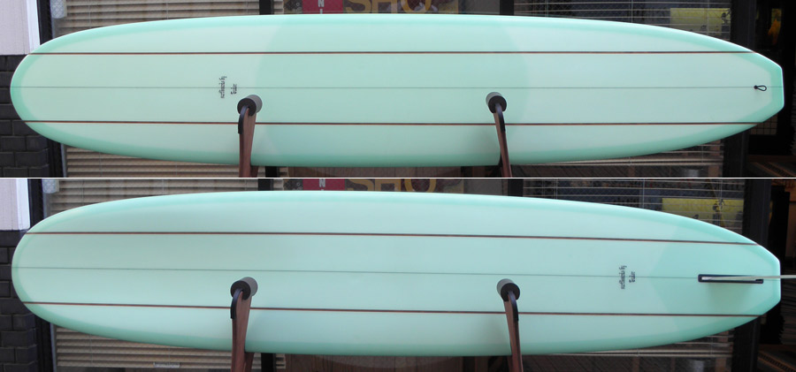 コンケーブの入り方、センター付近のボトムシェイプ、ロッカー、アウトライン、どれをとってもノーズライド、というボードです。ノーズに乗ったら、とても安定すると思います。初心者向けではありませんが、クラシックボードのコントロールをひととおり覚えて、次はノーズへ行きたいという人にはばっちりだと思います。グルーラインと2ストリンガーと作りも凝っています。