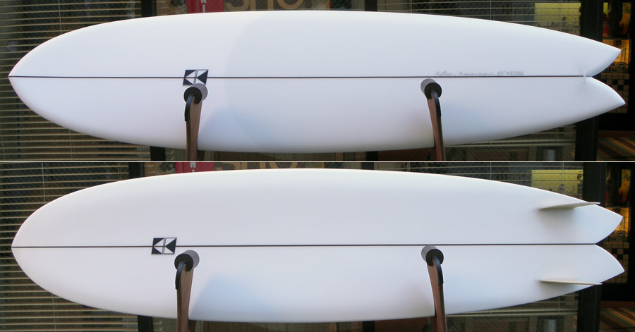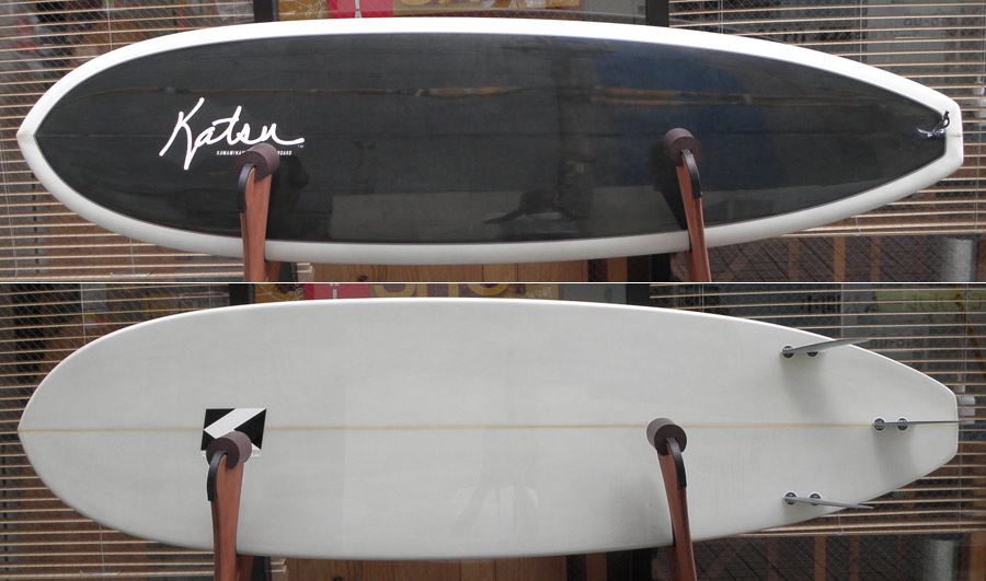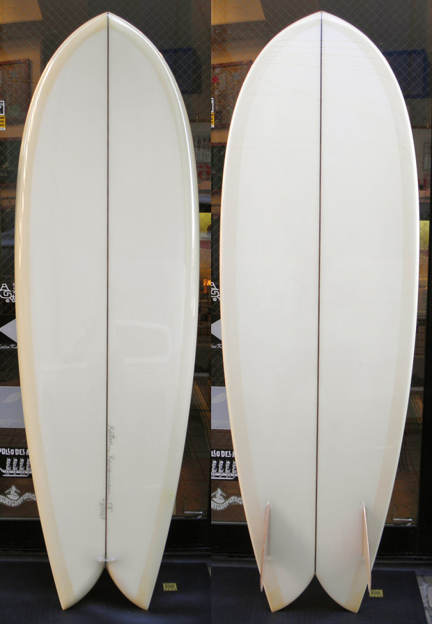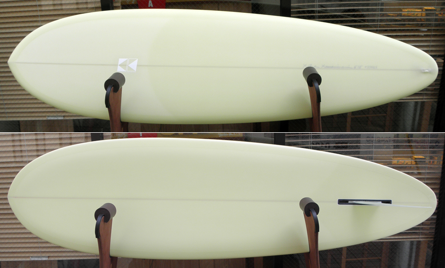 ひとつは5’8”のKK FISH。オーダーボードです。薄いベージュのティントで、ロゴ無しシェイプサインだけでシンプルに仕上げました。