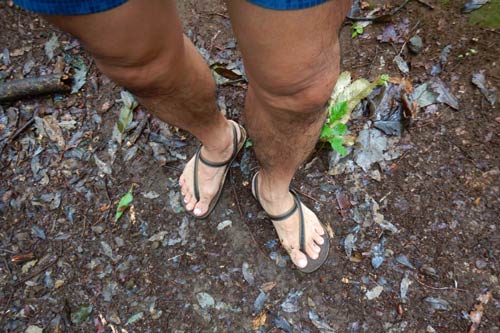 ベアフットは雨が降ってたって気になりません。ビブラムのアースランナーズという、ランニング用サンダルです。