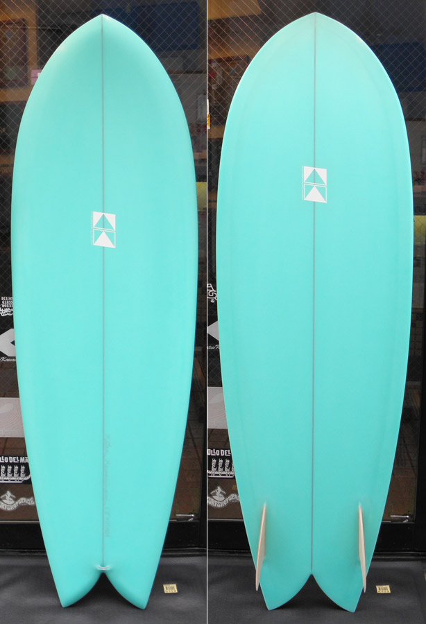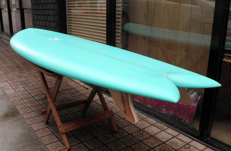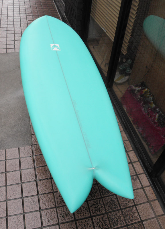 KK FISHが入荷しました。レングスは5’8”。ストックボードです。ウッディワゴンに使われているような、ミントグリーンのピグメントでラミネートしていただきました。