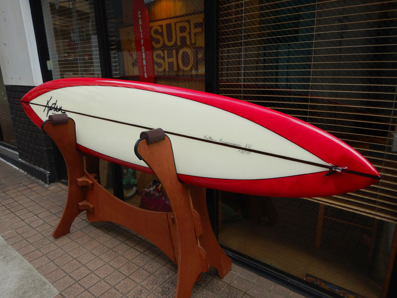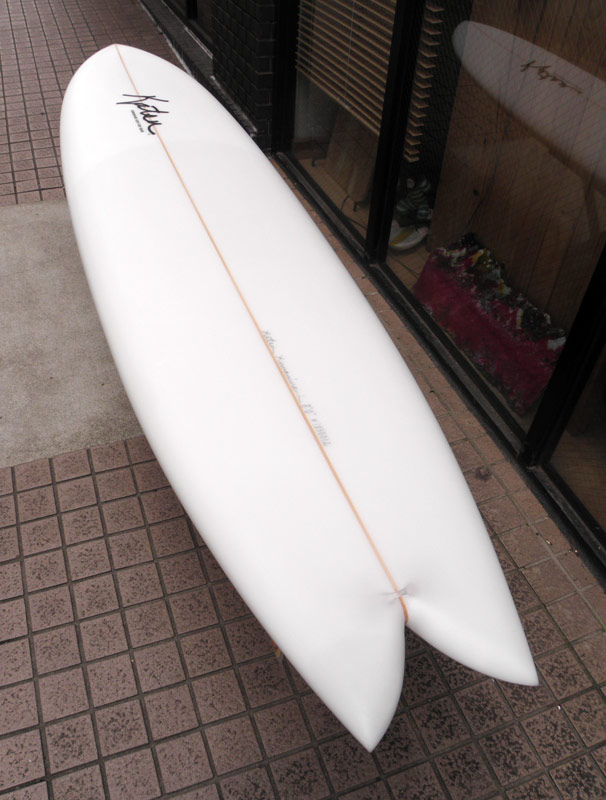 カツカワミナミサーフボード、もうひとつのツインフィンモデルの「ヌシ」です。オーダーでお作りしたボードです。レングスは5’8”。KK FISH、BOOGIE、BONITA、MOON FISH、それぞれ人気のツインフィンとフィッシュのモデルですが、若干それらの影に隠れがちなツインフィンです。