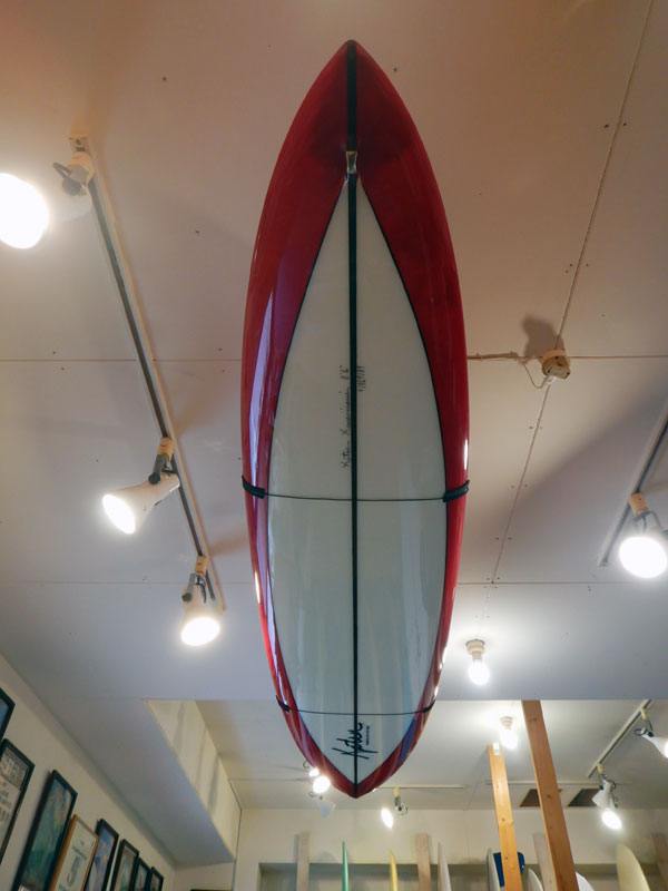 長い間、天井からぶら下がっていた8’6”のシングルフィン。ぶら下げたままじゃもったいないので、乗ってみようと降ろしてみました。もちろん使うつもりで作ったのですが、置き場がが天井だったのでついついぶら下げたままにしてしまいました。作ったのは8年前です。