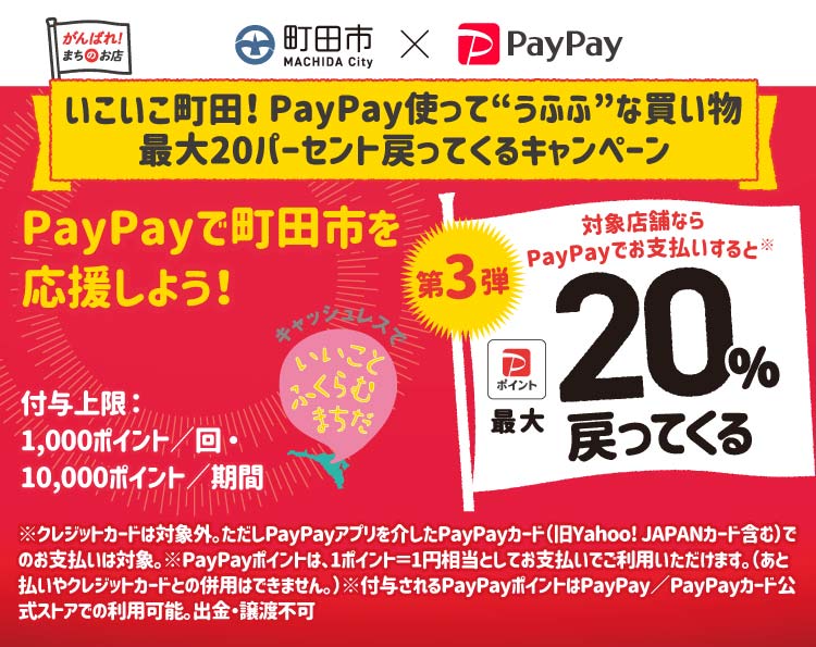 もうひとつは、町田市の協賛でPAYPAYのポイント還元キャンペーンが今日から開催されています。一回の上限金額が¥5.000までで、20%のポイントが付与されます。¥5.000のお買い上げで、¥1.000分のポイントが戻ってきます。期間中最大10.000ポイントまでということですので、¥5.000分x10回使えることになります。