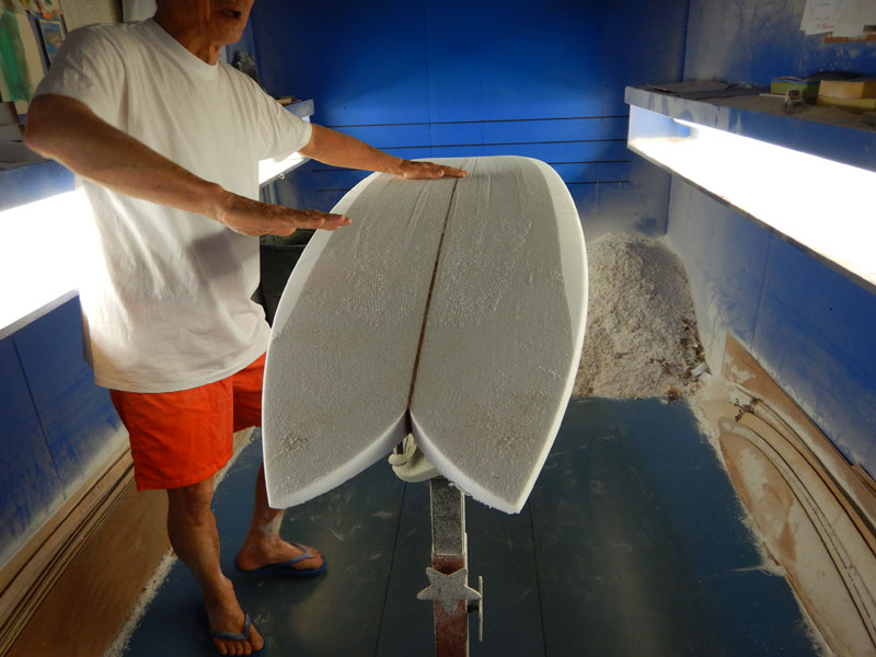 ボトムも同じようにプレーナーでコンケーブとレール(プリモのボトムです)のおおまかな形を作って、おそらく一番大切なパートと思われる部分にサーフォームの削り跡が見えます。活さんは、このロングフィッシュのアウトラインを語っているところです。