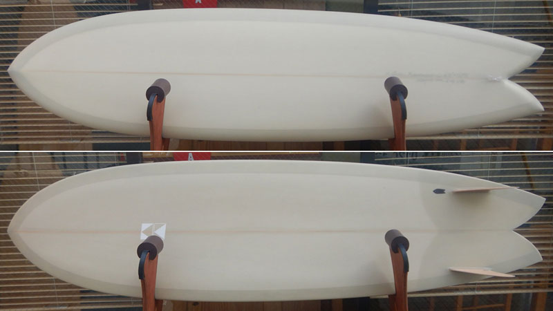 長いフィッシュはいろいろなシェイパーさんがシェイプしています。フィッシュをそのまま長くしたようなロングフィッシュもあります。活さんのロングフィッシュ(プリモフィッシュ)はどちらかと言えば、ツインフィンっぽいプレーニングと動きをしてくれます。テールは幅広のフィッシュテールながら、アウトラインはストレートではなくマニューバを考えた曲線を形作っていることとフィンの違いによるものです。