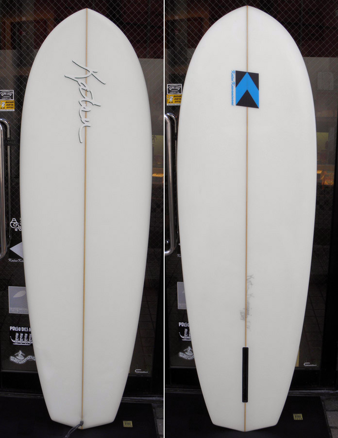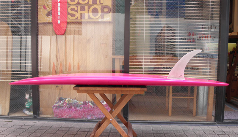 MINIモデルベースで、ダイアモンドテールのボンザーMINI5風アレンジのアウトラインと言ったところでしょうか。最初のインスピレーションは以前ユーズドで販売したこのシングルフィンです。5’10”のこのボード、かなり調子が良いとのことですが、ここがスタートです。