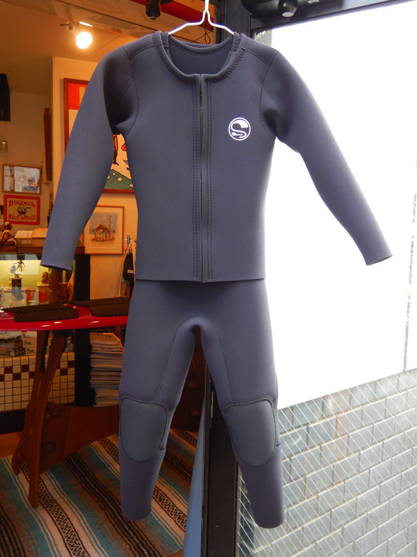 さて、先日書いた小学校一年生の女の子用のウェットスーツが出来上がりました。ロングジョンとジャケットのセットアップ。小さくてカワイイです。