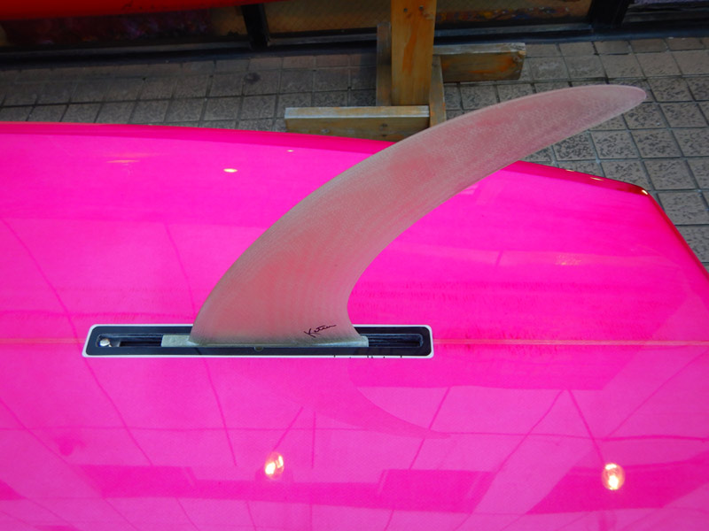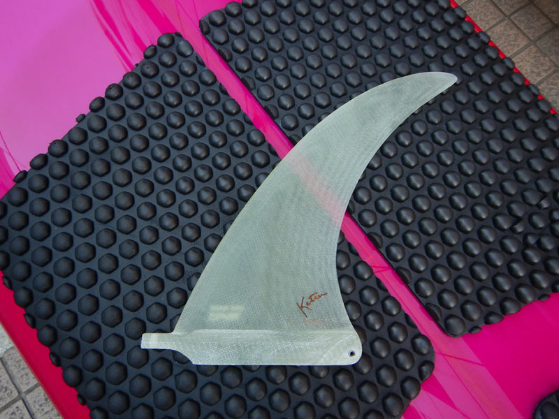 フィンは、まずはKK FLEX 9インチを使ってみます。小さいフィンで抵抗を少なくして、レールで波乗りするのが好きなのですが、この9インチを選ばせたのは、HULLライクなボトムとかなり前方寄りにしたフィンの位置です。