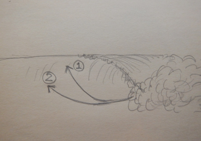実際のラインのイメージはこんな感じです。波のボトムからボードを上げようとすると、BONITA FISHは2番のように大きなラインになります。KK FISHのラインのイメージは1番で、より波を縦方向に上がっていくイメージです。