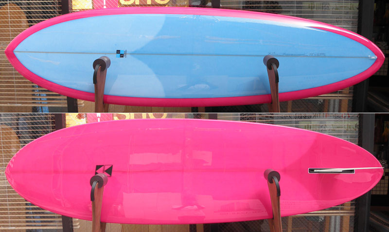 まずはこれです。ミッドレングスモデルのプリモの中では短めの7フィートちょうどのサイズ。マジェンタっぽいボトムのカラーが鮮やかです。