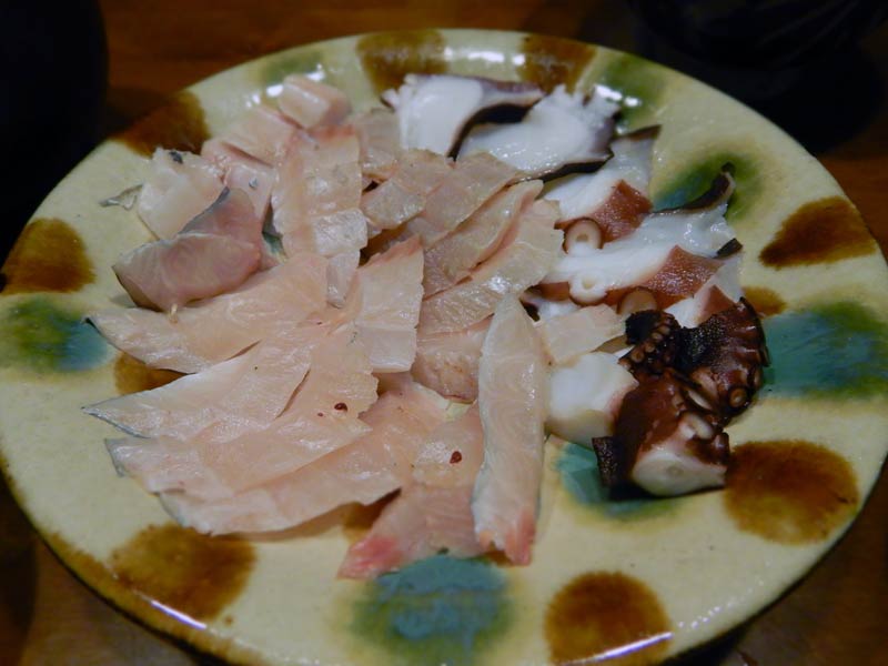 塩焼きといいつつ、よく太って美味しそうなので刺身にしてみました。脂が良く乗っていますが白身でさっぱり歯ごたえも良く美味しいです。地タコはお約束。