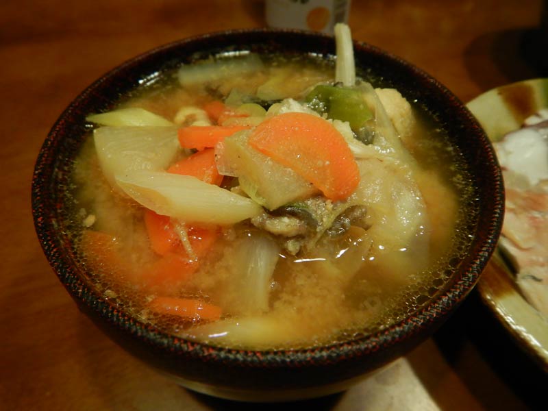 それから、アンコウ。すごい顔のまま買っても、困り果てそうなので切り身です。スーパーで買うよりも安くて新鮮です。入っていたアラと昆布でダシをとって、ネギ、しょうが、ニンジン、大根で味噌汁です、アンコウの七つ道具と言いますが、いろんな部位が入っていて、コリコリ、フワフワ、キシキシ、モッチリとさまざまな食感と味が楽しめます。