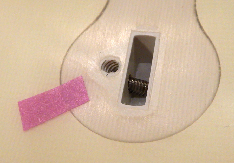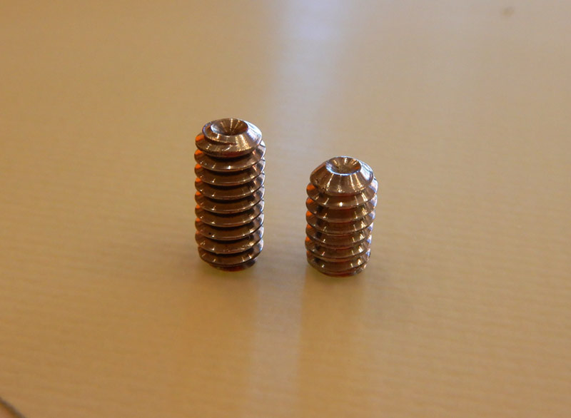 さてどうしようかと考えて、ネジ穴の手前の山を使うことを思いつきました。ネジ穴の奥はネジが抵抗なくクルクル回ってしまいますが、手前はまだ残っています。そこを使える長さのイモネジがあれば締められるはずです。
