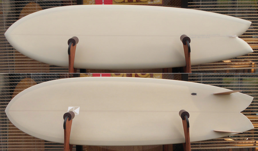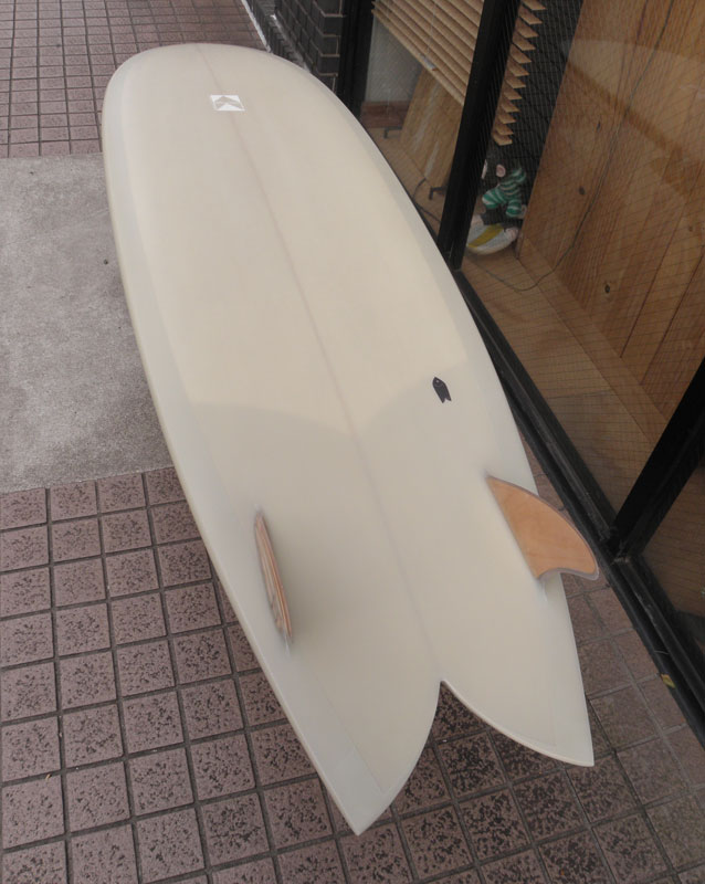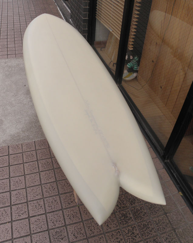 出来上がったばかりの、6’10”フィッシュ。シングルフィンのプリモと同じロッカーのブランクスを使って、レールとボトムのシェイプも同じなので、プリモフィッシュと呼ばれています。