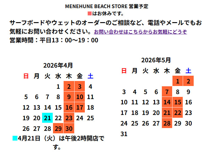 MENEHUNE BEACH STORE 営業カレンダー