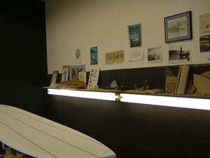 クリスはランチに出ているようだ。だれもいないシェイプルームに入ってみると、11フィートは楽にありそうな3本ストリンガーのブランクスがテイクダウンされた状態で置かれている。壁のラックにも同様の長さのフォームが数本。サンディエゴスタイルの一つ、トリムサーフィンのためのウルトラグライダーが、今まさに削りだされようとしているところだ。古いサーフムービーのポスターや、プレーナーで有名なSKILのアンティーク風の壁掛け時計が飾られ、整然とした雰囲気を保っているのはクリスの性格の現われであろう。