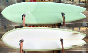 リサイクルの結果、生まれてきたのがエコロジーカラーとも呼ばれるこのベージュです。真っ白なクリアラミネートのサーフボードに見慣れていると、抵抗を感じるかもしれません。