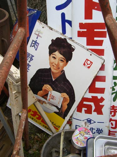 松山容子さんのボンカレーの看板。由美かおるさんの蚊取り線香と眼鏡が落ちちゃう大村昆さんのオロナミンCの看板と一緒に昔はあちらこちらの家や商店の壁に貼ってありましたねー。昭和の雰囲気プンプンです。当時95.000枚作られ、大塚食品の営業マンがPRをかねて一枚ずつ取り付けたそうです。