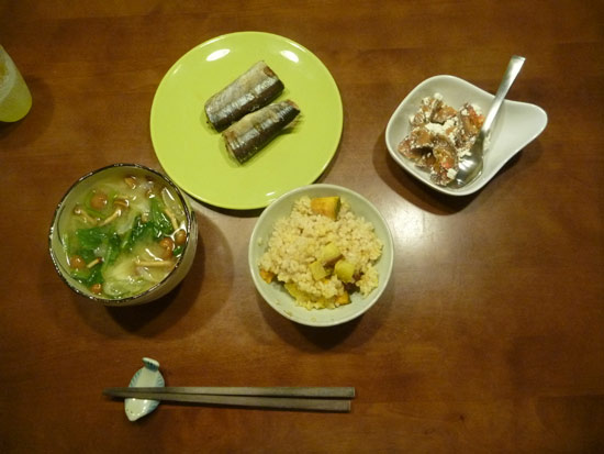 サンマになめこの味噌汁、炊きたてご飯に焼いたイモとカボチャを混ぜると美味しい混ぜご飯のできあがり。玄米とイモとカボチャの三重奏、たまりません。ゴハンだけで三杯いけます。走らないと太ります。デザートは柿とカテージチーズ。