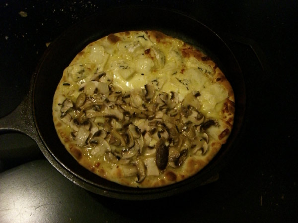 ハーフ&ハーフで、半分にはさらにカマンベールとブルーチーズを乗せて「4種類のチーズピザ」に(笑)そしてもう半分には薄切りにしたマッシュルームをたっぷり載せて、アンチョビを散らして薪ストーブの火で直火焼。