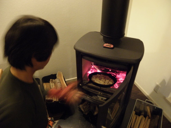 こんな感じで、スキレットに乗せて薪ストーブの中に入れちゃいます。