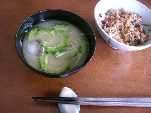 朝の味噌汁。氷がはいった冷たい味噌汁です。具は塩もみしたゴーヤと千切りのショウガ。夏の朝は熱い味噌汁を飲んだだけで汗をかいてしまうので、こんなおつゆでリフレッシュ。ゴーヤの苦味としょうがのピリリで目がしゃっきり覚めます。