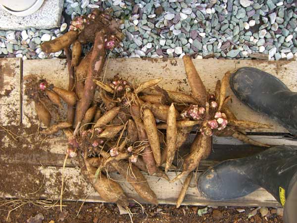 ほったらかしで水もあげてませんがちゃんと育ってます。結構大きいのも付いていました。豊作かどうかはわかりませんが、これだけあれば当分食べられます。ヤーコンはサツマイモみたいですが、全く違う食感の野菜です。生でもシャクシャク美味しいです。来年の種になる部分を分けて涼しいところで保管しました。
