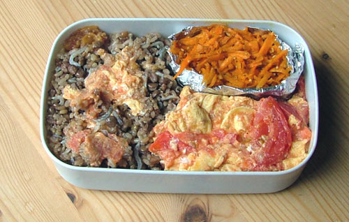 今日のランチは、トマトと卵の炒め物と人参サラダ。それに玄米ごはんのチリメン混ぜに梅肉少々。なにやらべっちょり見えますが美味しかったです。