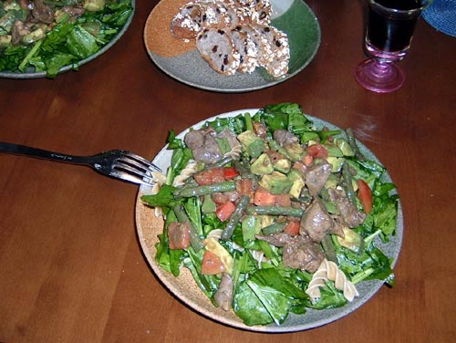 そいでもって、昨日の晩ご飯。面倒くさいのでワンディッシュでコンプリートのディナー。ほうれんそうとアヴォカド、チキンレバー、インゲン、トマトに少しだけパスタを加えたサラダ。ワンディッシュでマンプクです。