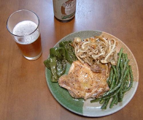 昨日の夜は一人めし。一人めしのときは、フライパン一つにいろんなものを放り込んで、酒をちびり、ちびりとやりながら本やビデオをみながら出来上がりを待つ料理が楽しいです。チキンのソテーにその横で丸ごと焼いたピーマン、インゲン、えのきは最後です。種を取らないで、丸ごとクタクタに焼いたピーマンはうまいですよ。シンプルに塩だけでいただきます。ビールは地元の「多摩の恵み」瓶内発酵で時間とともに味が変わります。この瓶は4ヶ月目。コクが増して、軽いハニーエールのような甘みが出てきています。こういうビールは澱があるので、買ってきて家の冷蔵庫でしばし立てた状態で冷やして、静かに注ぎます。皮をむいたり、切ったりという作業はほとんどないので、調理時間20分ほどで出来上がり。洗いものも皿一枚とフライパンだけ。お手軽です。