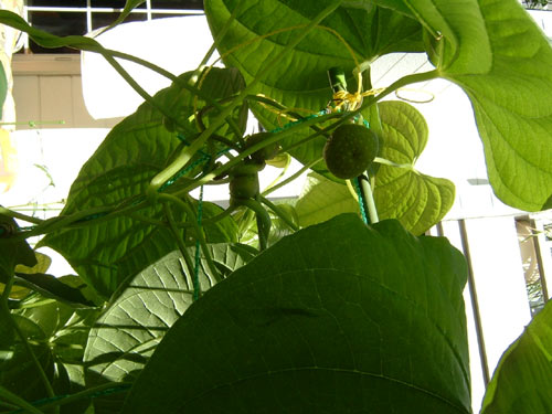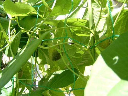 トマトやオクラも終わりに近づいてきましたが、いまはこれが元気に成長しています。ムカゴのように空中に変わった形の芋が生ることから「宇宙芋」と呼ばれています。成長すると赤ちゃんの頭くらいの大きさになるそうです。花は咲かず、茎のあちこちにいきなり芋ができてきています。自然薯みたいに美味しいそうです。