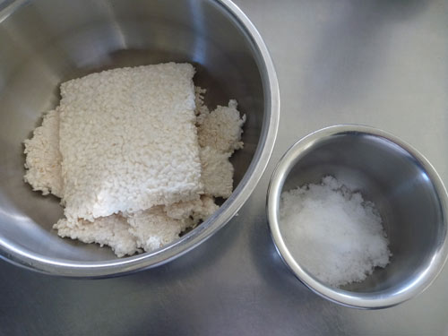 作り方は簡単。材料は米こうじと米こうじの重さの約30%の分量の塩、それに水です。