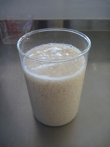 まず塩こうじ。完成品は割高なので自分で作ります。作り方は超簡単。米こうじを買ってきて、米こうじの重さの30%の分量の塩を加えて広口のビンに入れ、麹が空気に直接触れないくらいの水を入れるだけです(写真みたいな感じ)