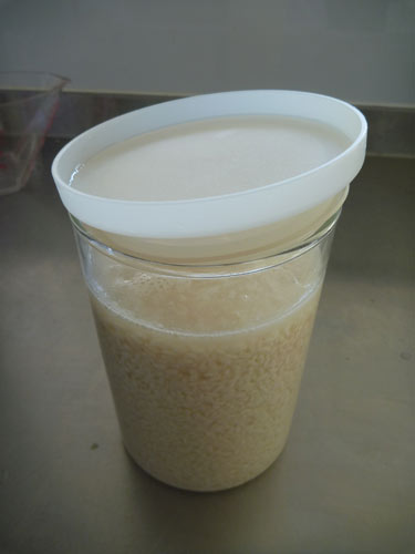 フタをゆるくして常温においておくと発酵がはじまります。一晩くらい置くと、こうじが水を吸って水が減ってこうじが空気中に露出しますので水を足します。