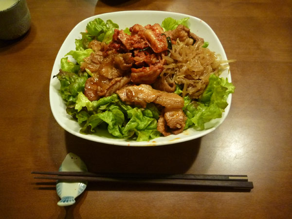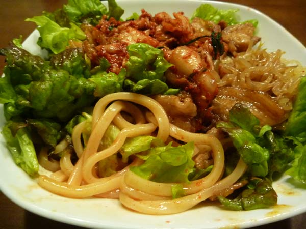 茹でたうどんをコチュジャンで和え、その上に上のどんぶりの牛肉と同じに味付けした豚肉。ごま油、醤油、酢で味付けしたサニーレタスを乗せ、さらにキムチともやしナムルを乗っけて出来上がり。