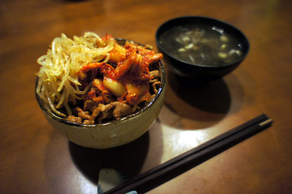 炊きたての白いご飯の上に、酒、醤油、みりん、砂糖、コチュジャンで味付けてして炒めた牛肉を乗せて、その上に美味しいキムチと自家製もやしのナムルを乗せてビビムパのように、混ぜ混ぜして食べます。