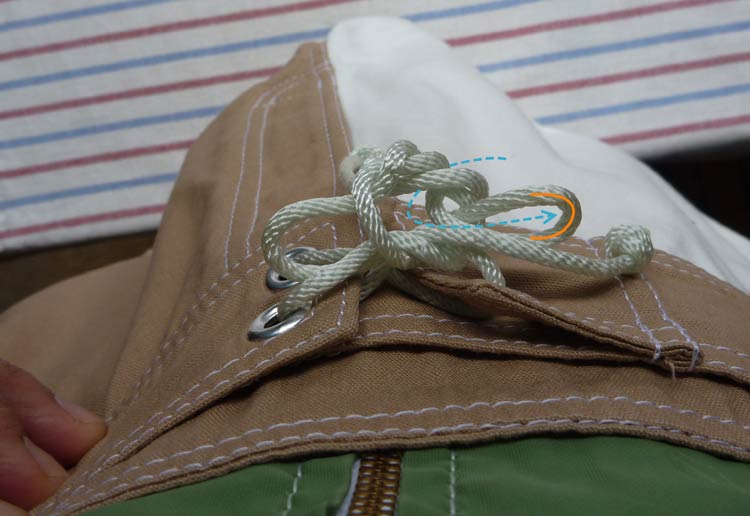 これでもうほどけません。あらかじめヒモにワックスを軽く塗っておくとなおさらかっちりです。ほどくときは普通のチョウ結びと同じです。