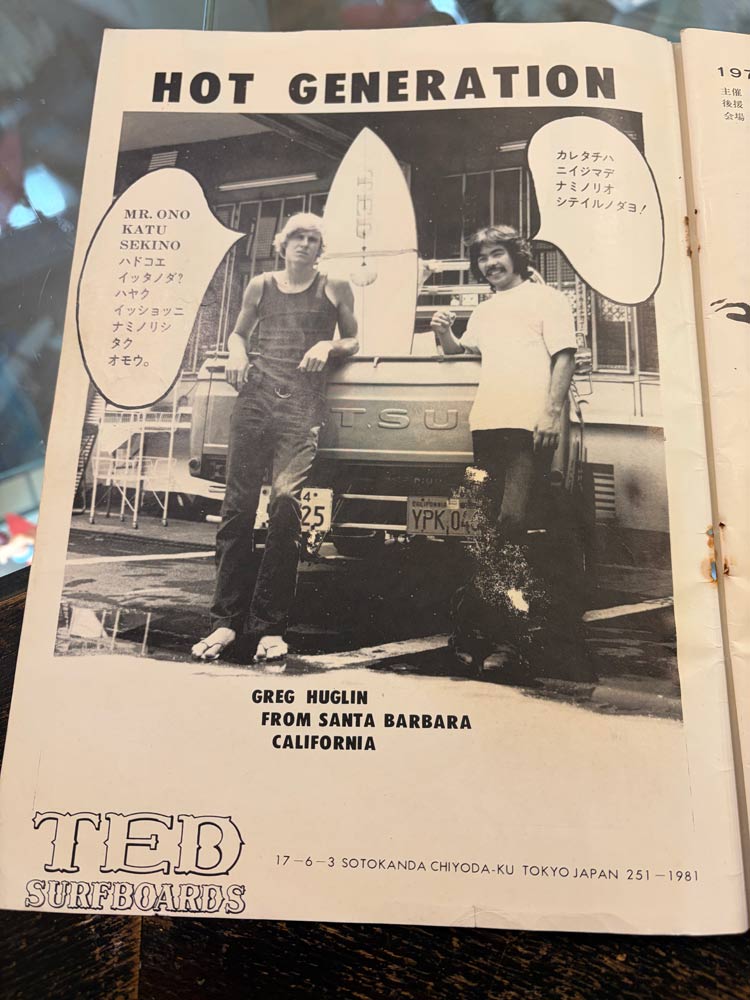 TED SURFBOARDSはTEDさんとグレッグ・ハグリンというサーファー/ムービーメーカーです。KATU(活さん)タチハドコイッタ?と訊いているのに、TEDさんがニイジマイッテルヨと答えてます。カタカナなのは英語だから(この時代、そんな感じです)