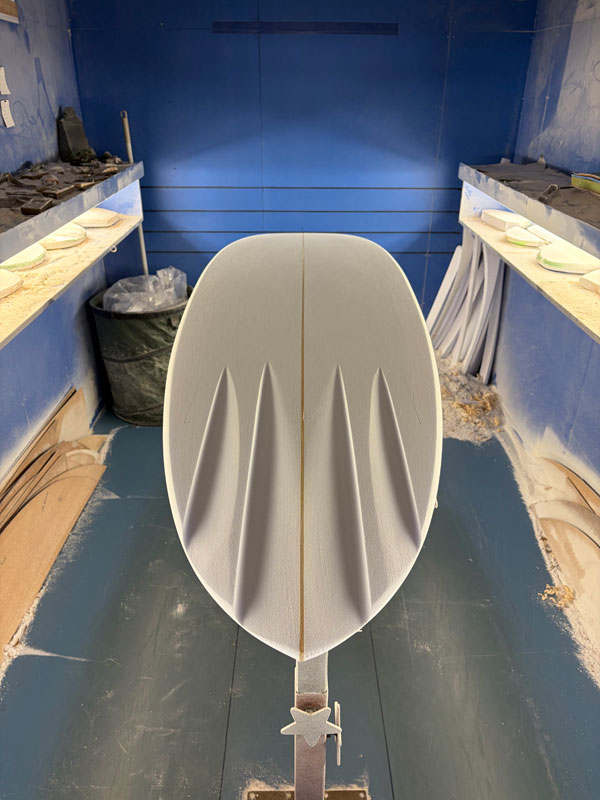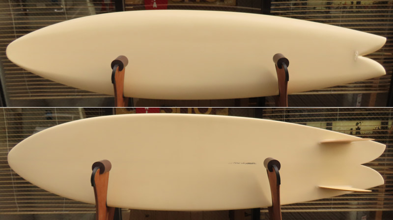 新しい試みとは言ってますが、チャネルの機能性はスタンディング、ニースタンスの両方で確認済です。フィンのポジションも決まっています。8フィートよりもさらに突っ込めると思います。楽しみにしていてください。