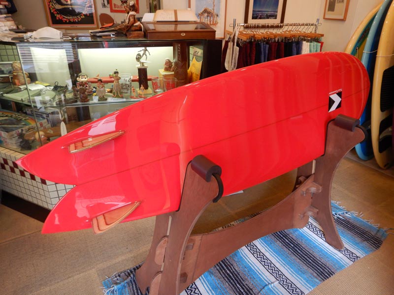 レングスは7’8”。ラウンドノーズのロングフィッシュです。カラーは赤に近いバーミリオンティント。ツヤを出さないマットな仕上げです。