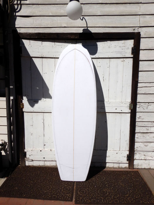 この8フィートのフィッシュは、フィンのセッティングに少しだけモダンな要素を取り入れてマニューバ性を(クラシックなフィッシュのセッティングよりも)高めることに加え、テールを絞り気味にしてカーブを付けています。先週の写真です。