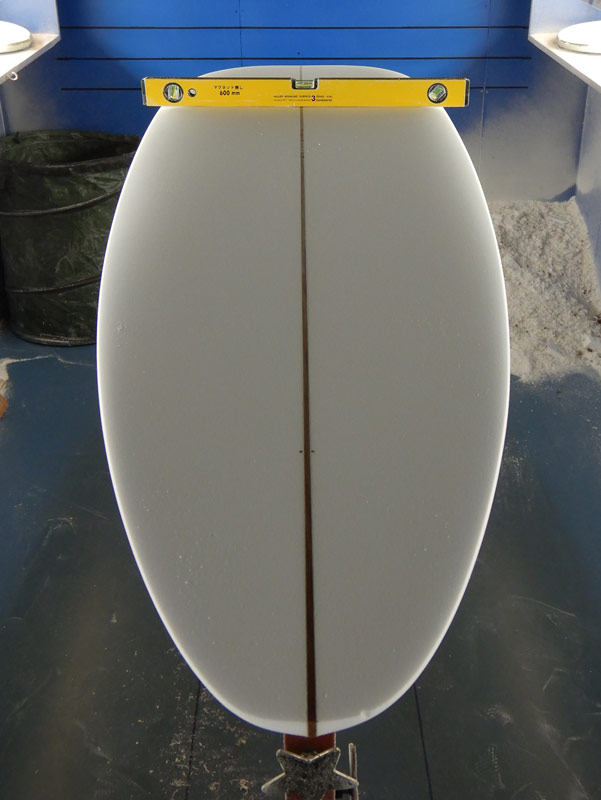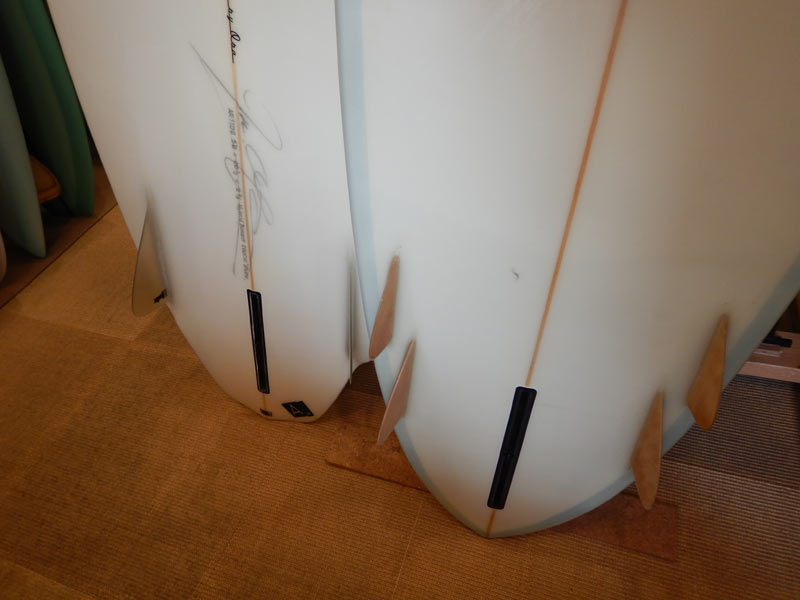 長いフィッシュのシェイプが出来上がりました。8フィートジャストです。フィッシュですから、もちろんツインフィンです。フィンのセッティングは、KK FISHと同じにしてもらいます。フィンはシングルフォイルのレイクが入ったキールフィンで、取り付ける位置はクラシックなフィッシュに比べて前寄りに取り付けます。
