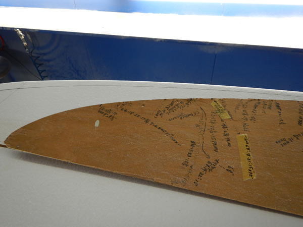 MINIのテンプレット。6’8”のフルテンプレットです。長いあいだ使われて、メモ書きがびっしりです。ハルのラインも昨年からここに加わってます。