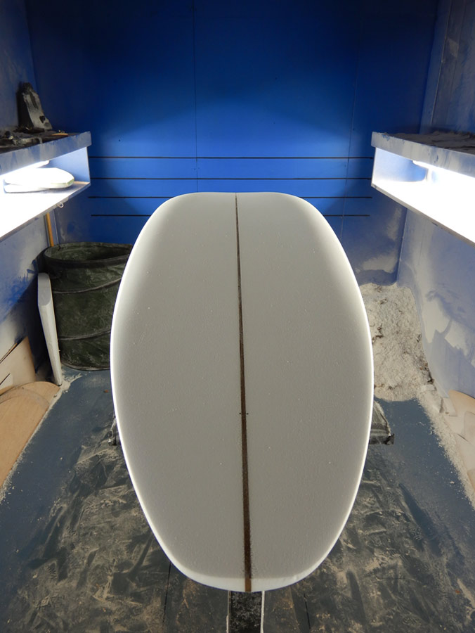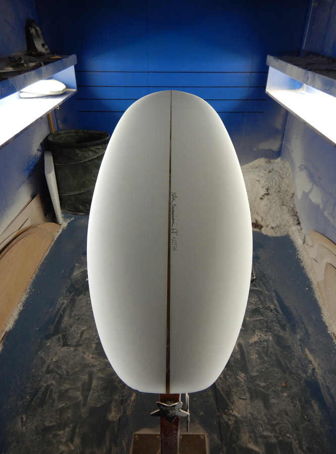 そしてもう一本はシングルフィン。お待ちかね、6’8”のスタビー、出来上がりました。シェイプの模様は過去ブログをご覧ください。