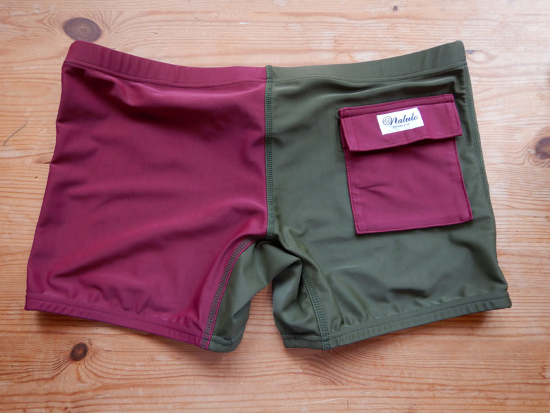 皆さんが履いているナルトトランクスの裏地で作られています。昭和のスクール水着みたいですが、これやっぱりカッコいい。これで波乗りすると最高なのです(ホントです)。